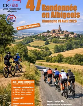 Le Cyclo Randonneur Albigeois organise la 47e randonnée en Albigeois, ouverte à tous les amteurs de vélo (y compris électriques) appartenant ou non à un club. Rendez-vous fixé de 7h30 à 9h30 au stade Mazicou pour les inscriptions et un accueil café avec un premier départ à 8h.